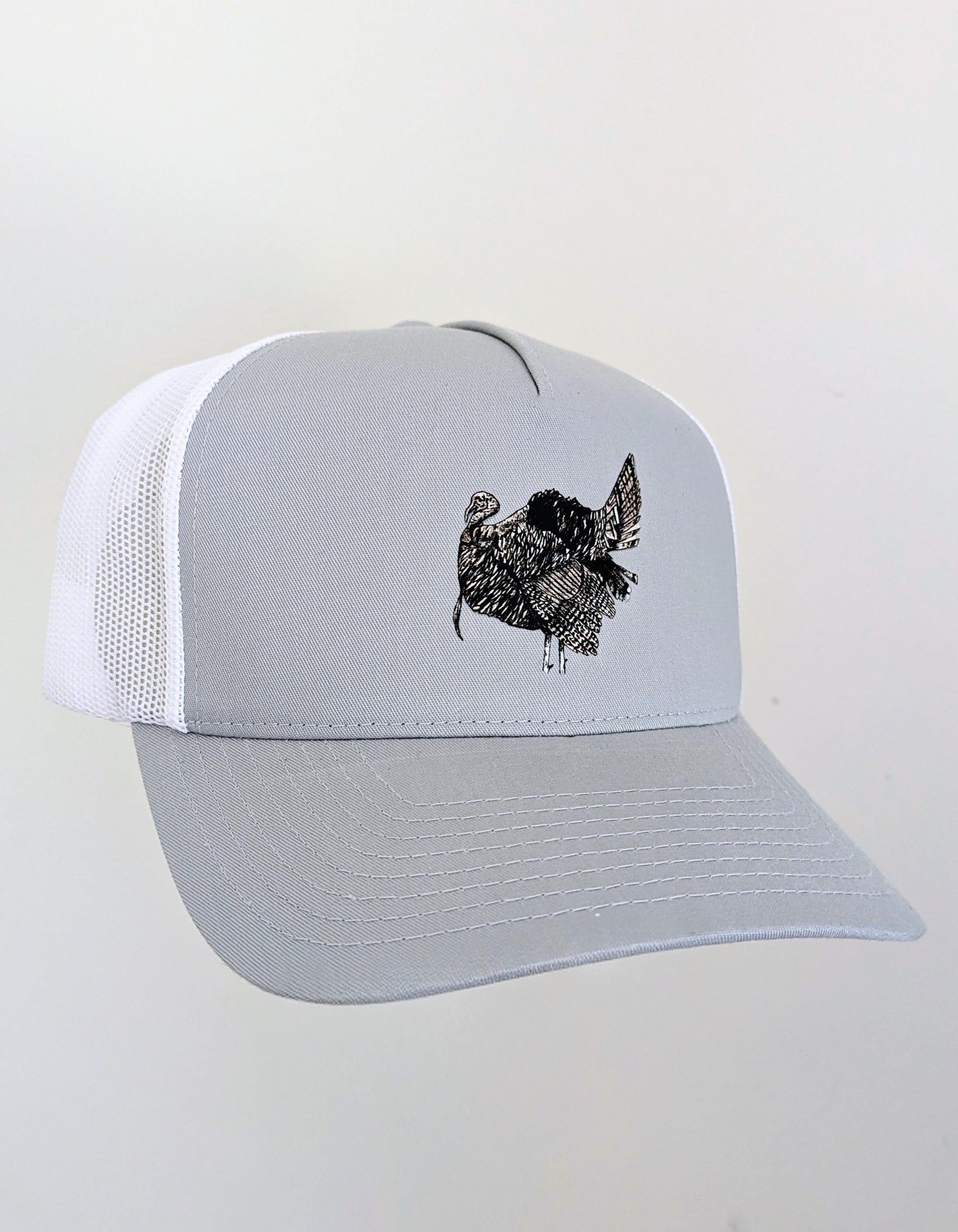 This silver/tan and white trucker hat features a detailed pencil-style sketch of an eastern wild turkey. Designed for hunters, and outdoor folks who appreciate the art in every feather.